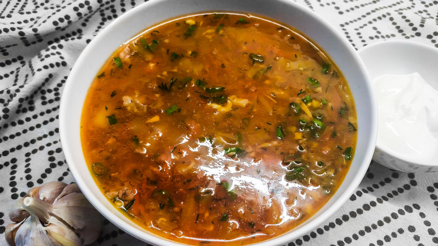 Положите капусту с помидорами, приправьте солью и перцем. Доведите до кипения, затем томите под крышкой на слабом огне в течение всего времени приготовления бульона.