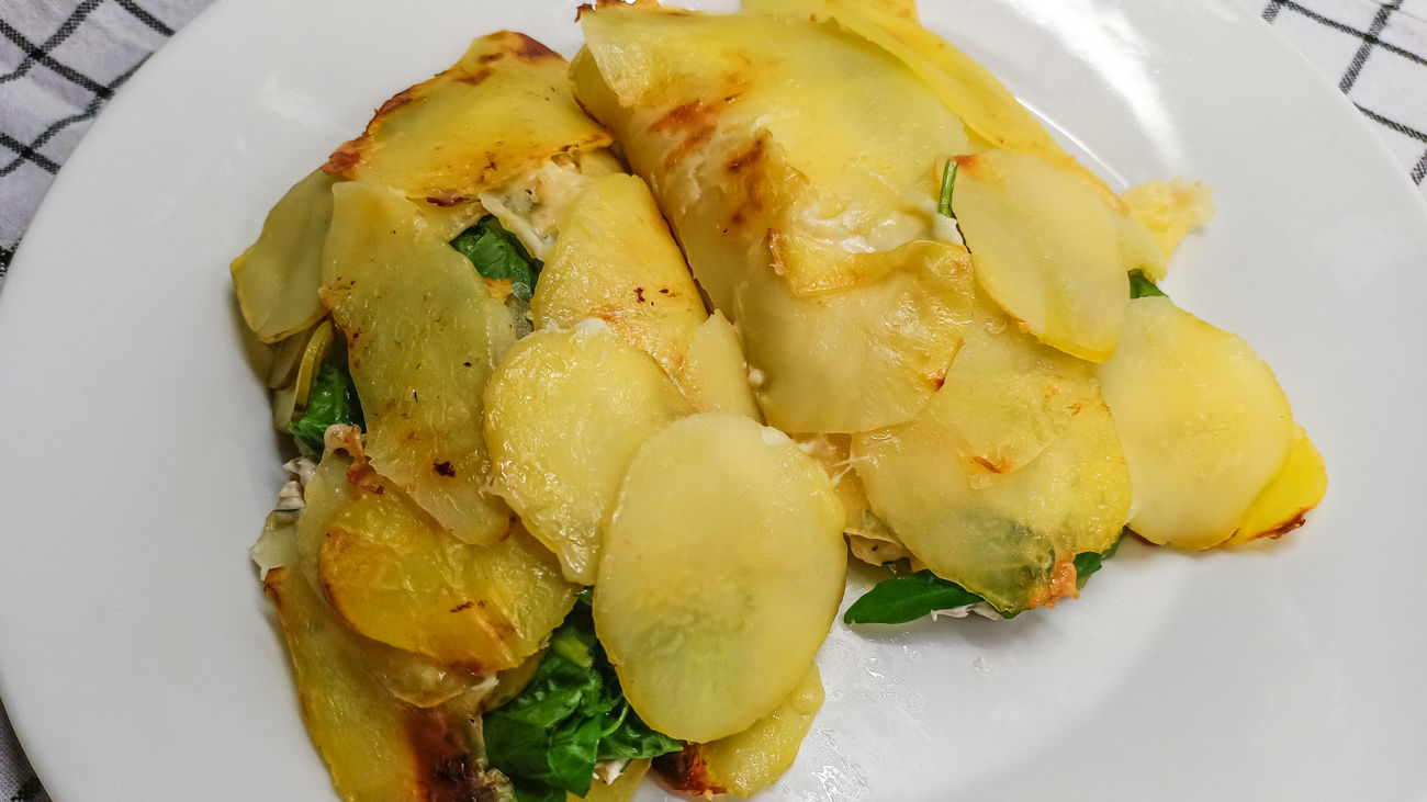 Картофель чистим, нарезаем тонкими кружочками, отвариваем до мягкости. Раскладываем на противне, формируя четыре круглые основы. Выпекаем 10 минут в духовке при 180°С.