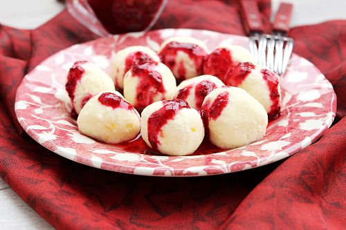 Ягоды можно заменять сезонными вариантами или использовать запеченные сливы. Полейте творожные шарики соусом перед подачей.