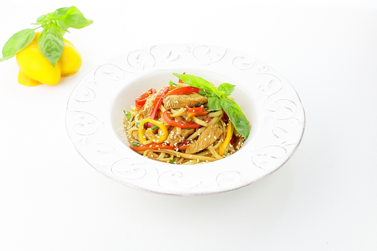 Классический удон с курицей и овощами готов к подаче. Наслаждайтесь трапезой!