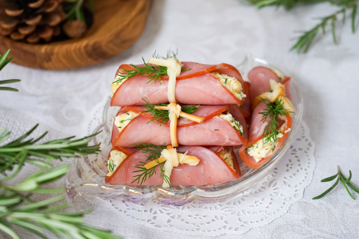 На каждый ломтик ветчины выложите ложку начинки и скрутите в трубочку.