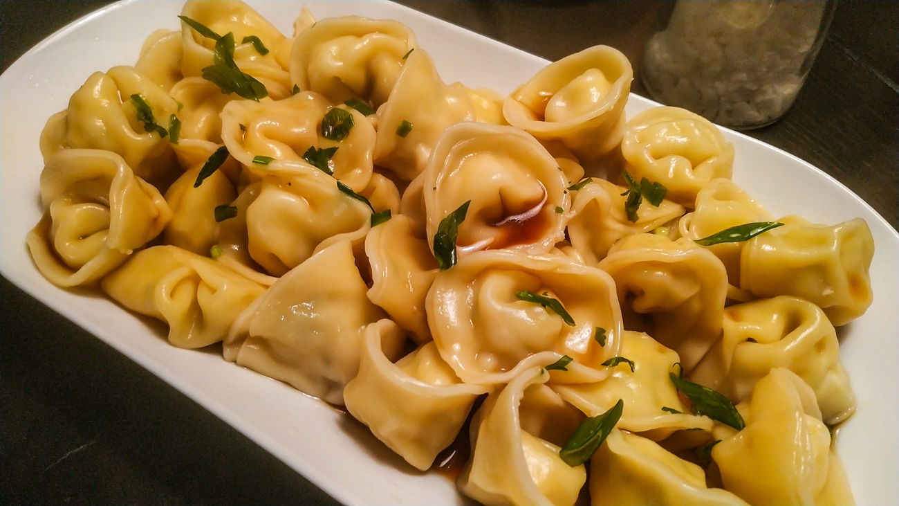 В кипящую воду (1.5 литра) вливаем соевый соус, добавляем лаврушку и горошины душистого перца. Варим изделия партиями по 2-3 минуты после того, как они всплывут.