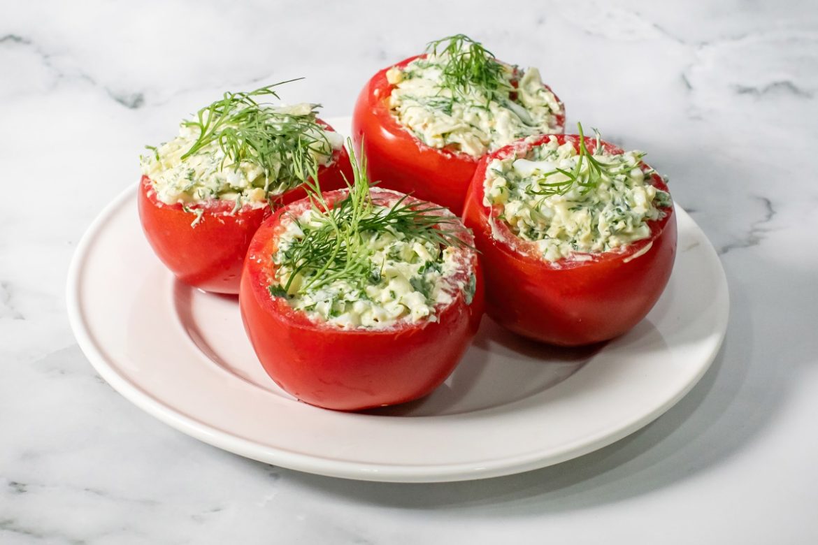 Наполните томатные «корзинки» сырной массой, используя кондитерский мешок или ложку. Распределяйте начинку равномерно для эстетичного вида.