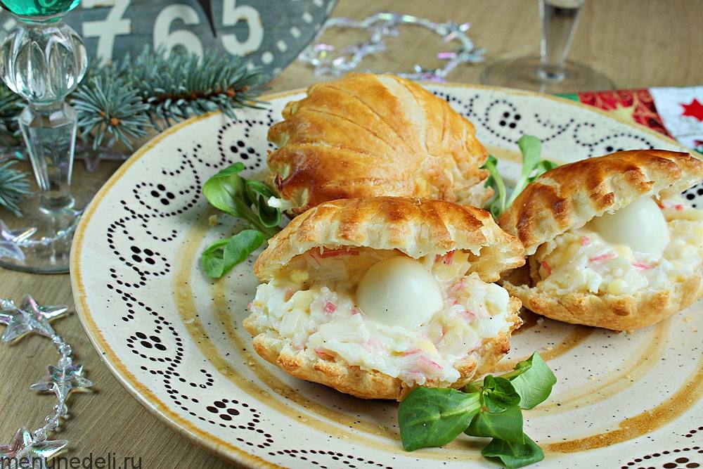 Для начинки подойдёт любой салат. Предлагаю вариант с крабовыми палочками и перепелиными яйцами, которые также используют для украшения.