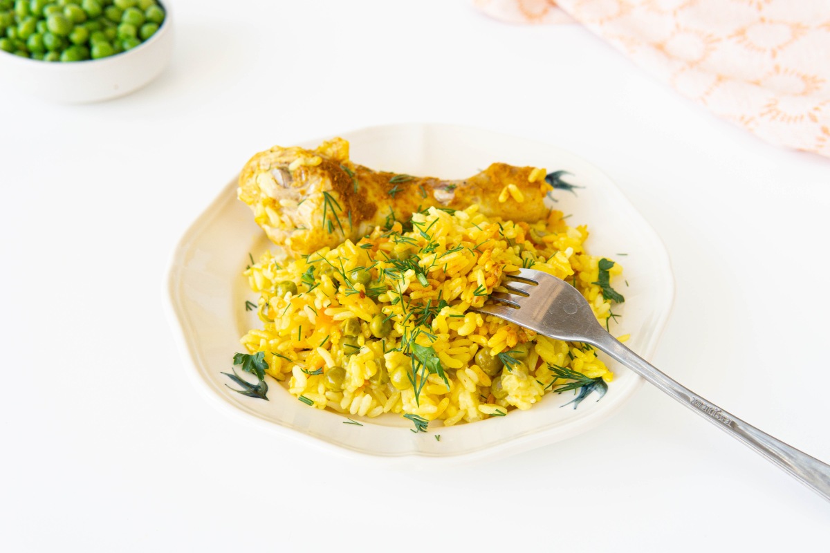 Подойдут любые куски птицы — в рецепте использованы голени. Для основы взят длиннозерный пропаренный рис, альтернатива — сорт Басмати.