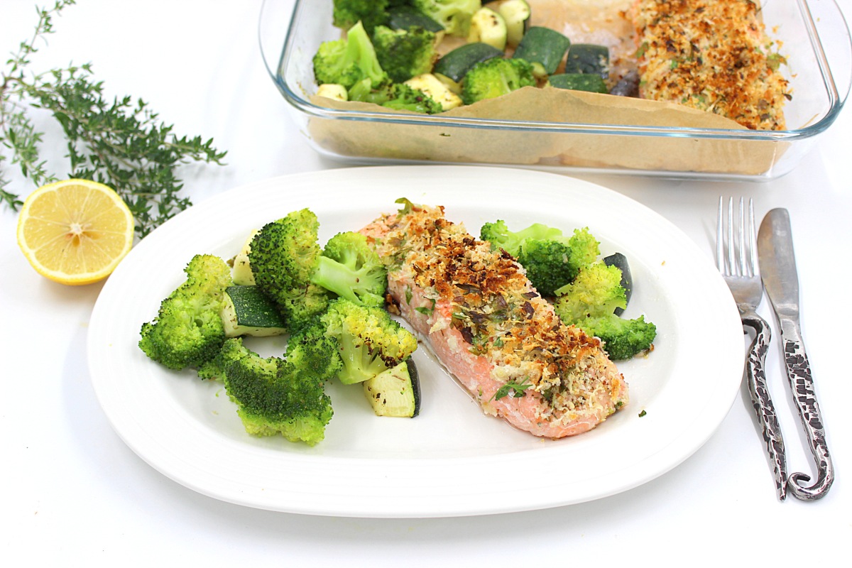 Распределить ингредиенты в форме для запекания: лосось, брокколи и цукини.