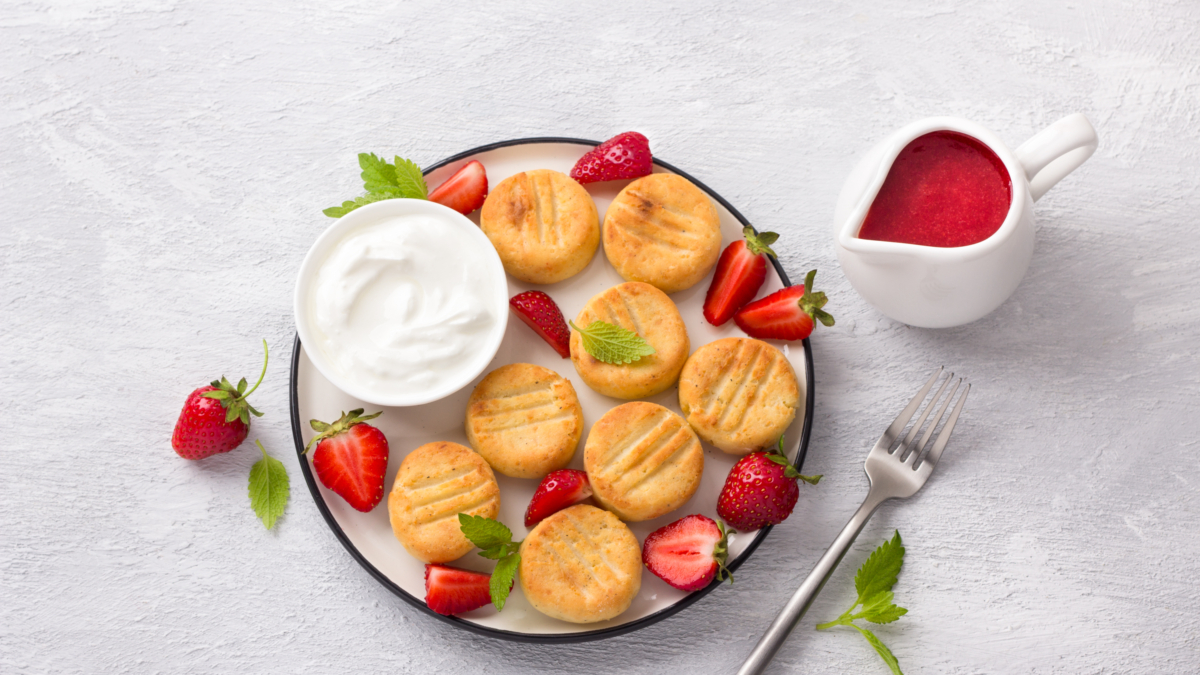 Отмерьте творог, оба вида сахара, крахмал и муку. Обработайте клубнику: промойте и удалите хвостики.