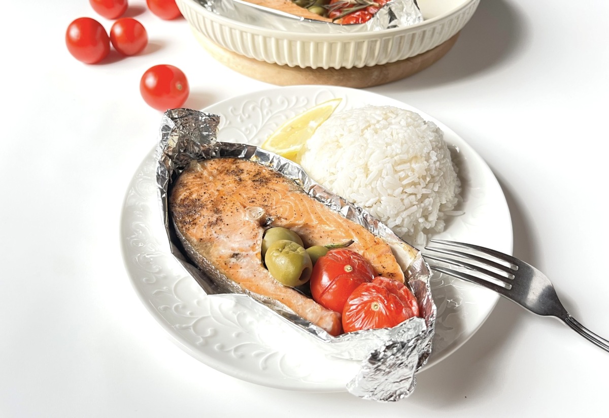 Готовность определяйте по равномерному светло-розовому цвету мякоти и прозрачному соку при надрезе. Подавайте в фольге с лимонными дольками и гарниром.