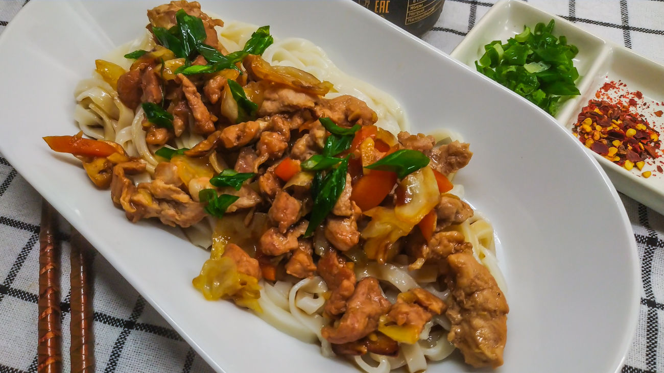Распределяем лапшу по порционным тарелкам, выкладываем сверху мясо с овощами, украшаем зеленым луком, кинзой или другой зеленью.