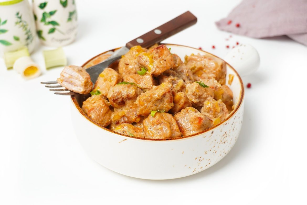 Соберите все компоненты для приготовления свинины в сметанном соусе. В качестве основы я беру свиную вырезку – ее излишки жира можно обрезать во время нарезки. Допускается использовать другие части туши, главное – минимизировать жировые прослойки. Перед готовкой мясо должно прогреться до комнатной температуры.